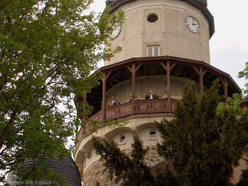 Vom Schloßturm eröffnet die Jagdhornbläsergruppe Wiesenburg das 12. Chortreffen