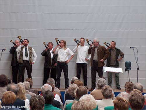 Dieses Jahr nicht vom Schlossturm, sondern in der Turnhalle am Stadion, eröffneten die Jagdhornbläsergruppe Wiesenburg das 15. Chortreffen