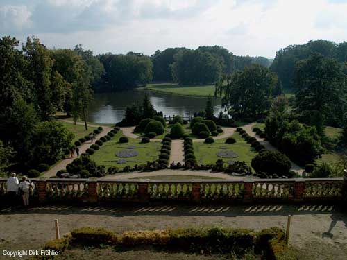 Der Blick vom Balkon des Gartensaals auf den Schlosspark.
