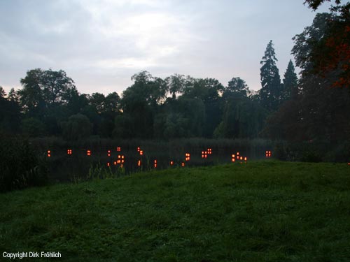 Auf dem Inselteich leuchten die roten Lichter und Laternen.
