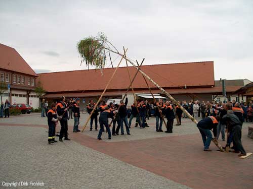 Die Kameraden der freiwilligen Feuerwehr Wiesenburg stellen den Maibaum auf (Bild 3)