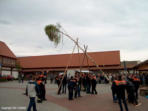 Die Kameraden der freiwilligen Feuerwehr Wiesenburg stellen den Maibaum auf (Bild 4)