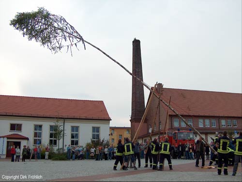 Die Kameraden der freiwilligen Feuerwehr Wiesenburg stellen den Maibaum auf (Bild 4)