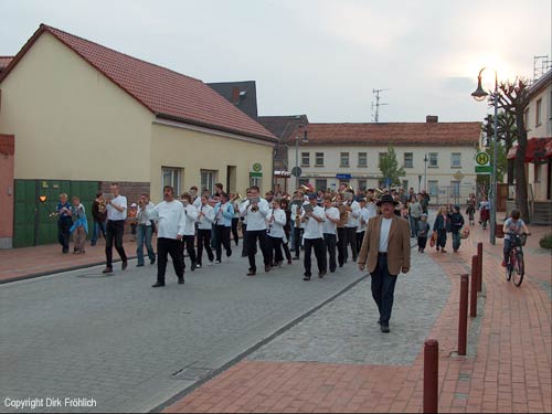 Falkelumzug mit dem Jugendblasorchester Wiesenburg. An der Spitze Bürgermeister Sieghard Rabinowitsch.