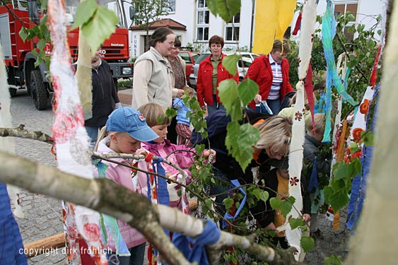 Kinder und Erwachsene schmücken den Maibaum
