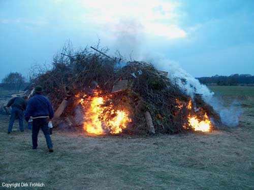 Der Wind half beim anbrennen des Osterfeuers mit.