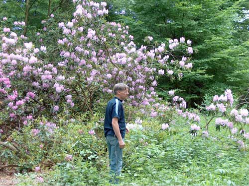 Landschaftsarchitekt Ulrich Jarke, erklärt wie sich die Rhododendrongehölze von Natureinflüsse, hier war es ein umgekippter Baum, wieder erholen